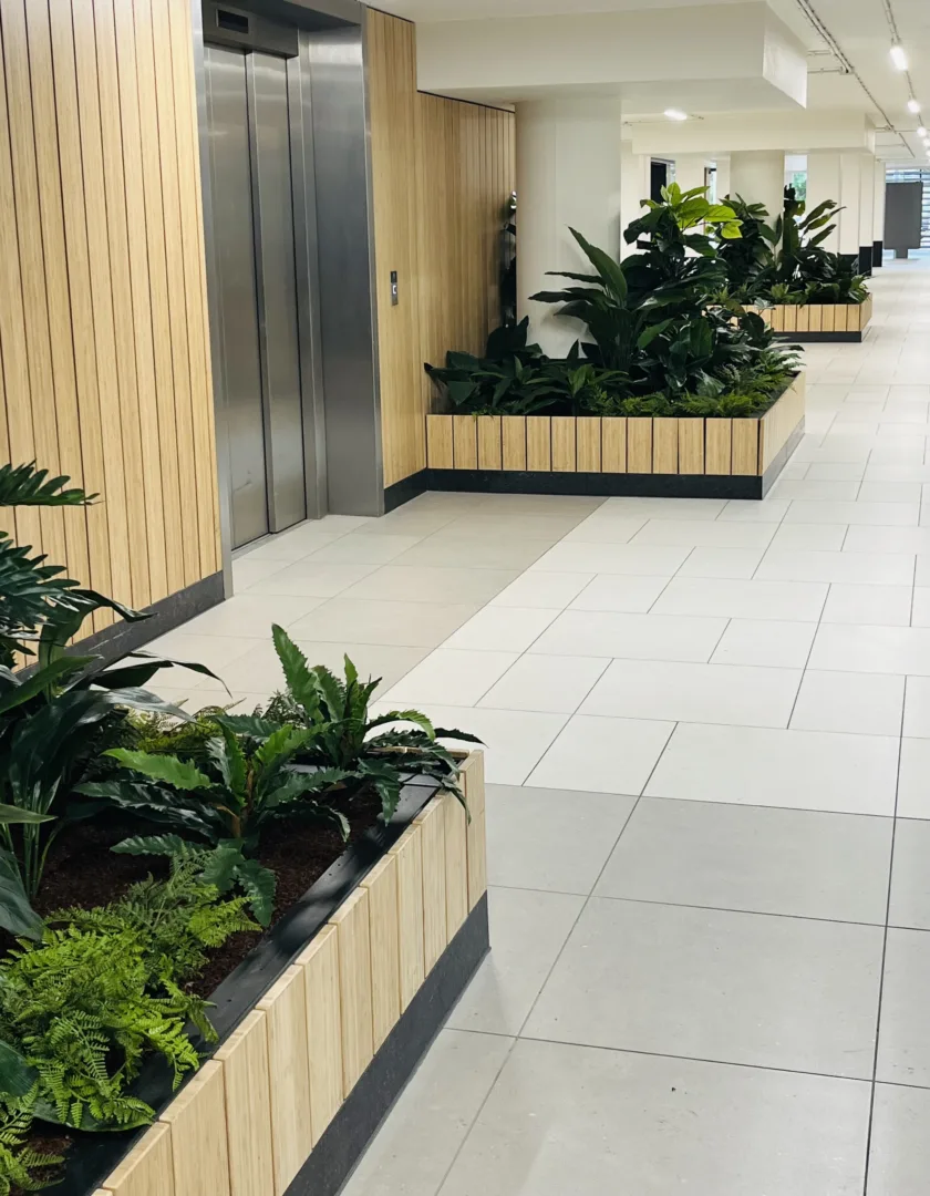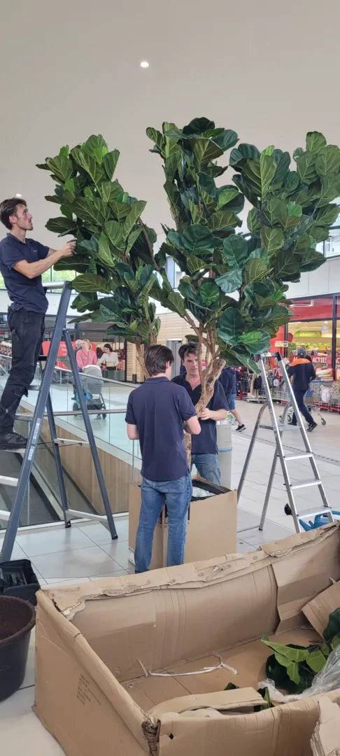 Op de verdieping staan bij de rolpaden twee ficussen op stam waardoor de zichtlijnen behouden blijven maar de sfeer en beleving in het winkelcentrum wel verbeterd is
